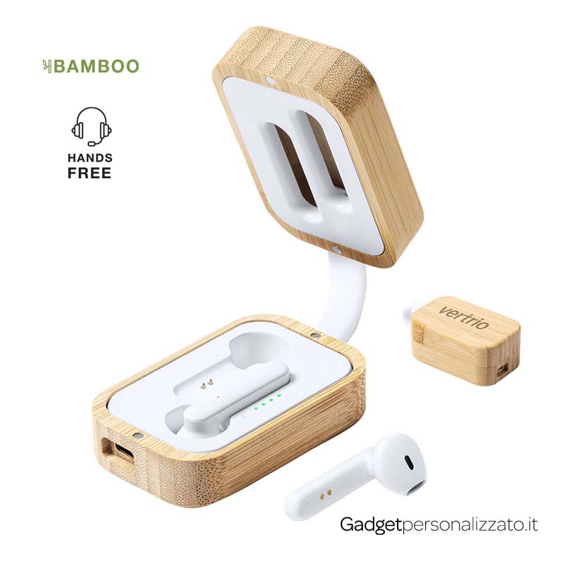 Dopo caricatori e speaker wireless, non potevano mancare gli auricolari senza fili nella loro versione in bambù. Con un’elegante finitura bianca in ABS e una custodia in bambù con funzione di ricarica, gli auricolari Tresan parlano di ricerca estetica e attenzione ai dettagli. Basta personalizzarli e parleranno anche del tuo brand!