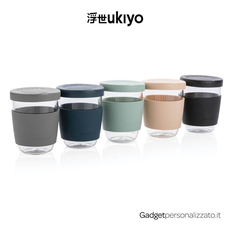 Munito di coperchio e fascia in silicone, il bicchiere in vetro borosilicato Ukiyo ha un design essenziale di ispirazione giapponese. I colori sono tenui, la forma armoniosa, la qualità indiscussa: manca solo la personalizzazione.