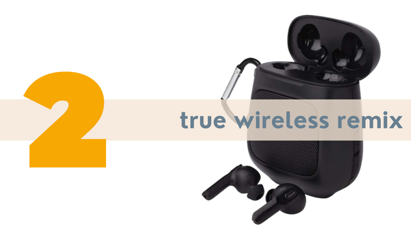 True Wireless Remix combina auricolari wireless e speaker bluetooth: la custodia funge infatti sia da stazione di ricarica per gli auricolari che da speaker.