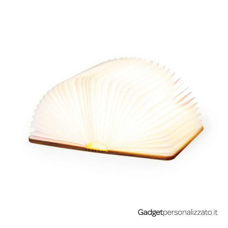 Ecco un esempio di gadget creativo e al tempo stesso funzionale. La lampada libro si apre come un volume, emettendo una luce calda e accogliente grazie ai LED integrati. Realizzata in legno, materiale sostenibile per eccellenza, è la scelta ideale se desideri sorprendere con un regalo originale e raffinato. È adatta sia ad ambienti di lavoro che a spazi domestici, dove garantisce visibilità al tuo brand.
